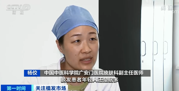 中国中医科学院广安门医院皮肤科副主任医师 杨佼:脱发患者年轻人还是居多,年轻人作息不规律,压力比较大,就会导致头皮的炎症和不健康。