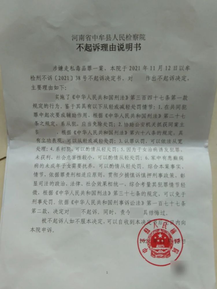 11月22日,李芳收到了中牟县人民检察院“不起诉决定书”,在决定书中,李芳仍被认定为“涉嫌走私、运输、贩卖毒品罪”,因“犯罪情节轻微”为由决定不起诉。