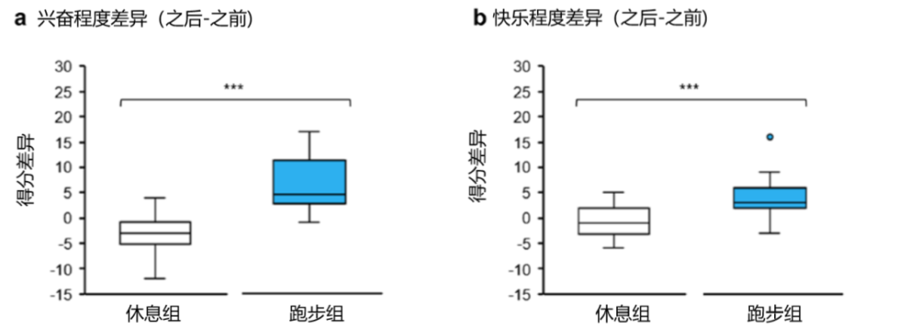 结果发现,相比于休息组,运动组的兴奋和快乐程度显著增加了!