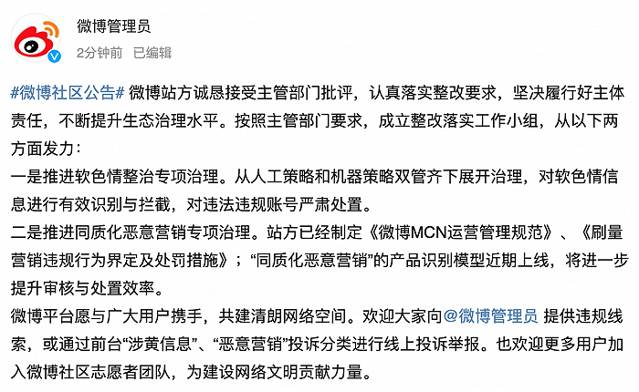 12月14日,@微博管理员 回应被处罚称,微博站方诚恳接受主管部门批评,认真落实整改要求,坚决履行好主体责任,不断提升生态治理水平。按照主管部门要求,成立整改落实工作小组,从以下两方面发力: