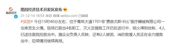 据@南昌经济技术开发区发布 消息,12月14日15时40分左右,位于青岚大道1701号“费森尤斯卡比”医疗器械有限公司一仓库发生火情。现场已救出4名职工,灭火及搜救工作仍在进行中,明火得到控制,4人已送往医院抢救当中。据企业负责人反映,还有2人被困,消防救援人员正在全力搜救当中,后续情况继续再报。