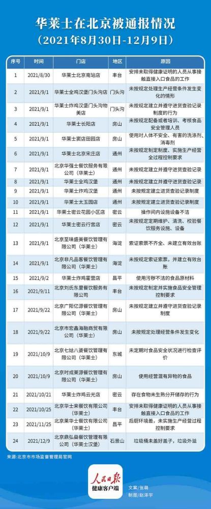 12月13日,健康时报梳理北京市市场监督管理总局发布的《全市餐饮业大检查情况通报》发现,自今年8月30日北京市市场监督管理总局官网公布全市餐饮业安全检查以来,截至12月13日,在近200条通报信息中,北京不同的华莱士餐厅共计被通报24次,仅9月1日一天,就有13家门店被通报。被通报门店共涉及丰台、门头沟、房山、通州、密云、海淀、昌平、东城、石景山9个区。