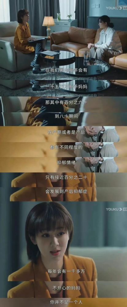 在《女心理师》剧中,贺顿对产后抑郁的詹璐说,“你不是一个人”。这句话,杨悠在做产后抑郁的咨询时也会经常提起。她觉得这句话有两层意思,首先“你得先让她们明白自己不是个例,减少自责和负罪感”,其次,对于生活在社会中的人,一举一动都会产生蝴蝶效应,也已不仅仅是“一个人”那么简单。