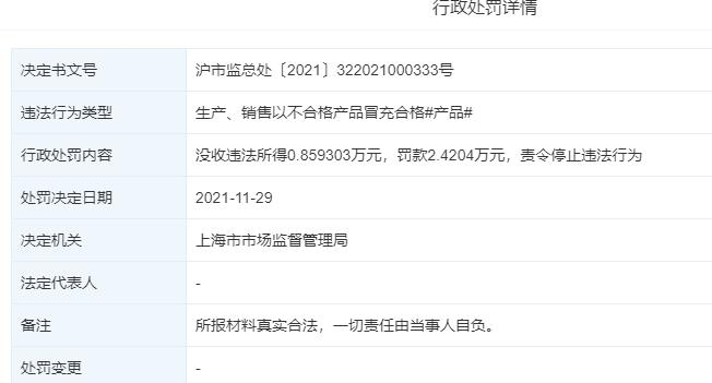 上述行为违反了 《中华人民共和国产品质量法》第三十九条的规定,依据《中华人民共和国产品质量法》第五十条的规定,上海市市场监督管理局责令当事人停止销售以不合格产品冒充合格产品的服装;处违法销售产品货值金额1.5倍的罚款24204元;没收违法所得8593.03元,罚没款共计32797.03元。