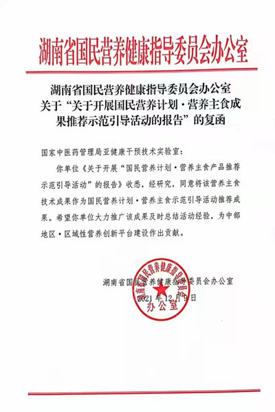 红网时刻12月15日讯(通讯员 侯君)2021年12月9日,由国家中医药管理局亚健康干预技术实验室历时12年研制而成的“亲睐控糖营养主食”获得了“湖南省国民营养健康指导委员会办公室”国民营养计划・营养主食示范引导活动推荐成果。