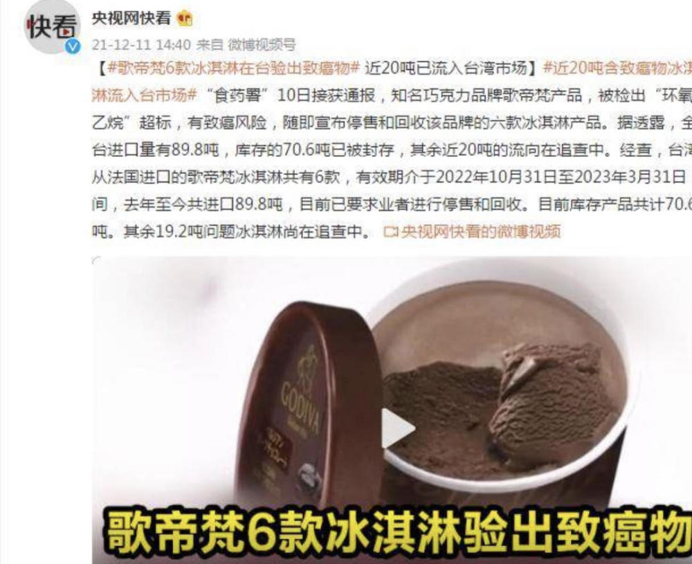 近日“食药署”通报,知名巧克力品牌歌帝梵产品被检出除害剂“环氧乙烷”,有致癌风险,随即宣布停售和回收该品牌的6款冰淇淋产品。据统计目前有近20吨的流向不明。