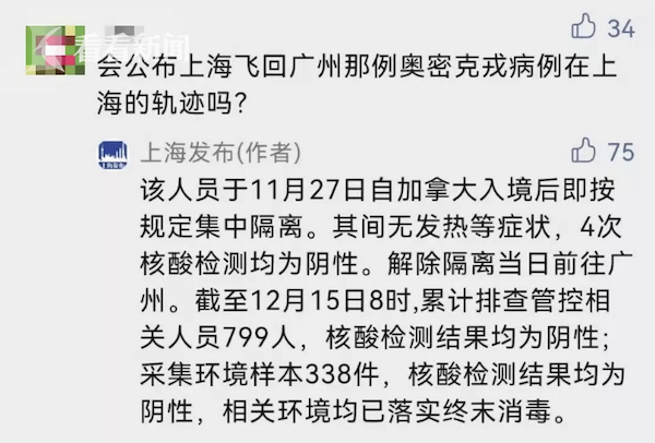 对此,上海发布回复:该人员于11月27日自加拿大入境后,即按规定集中隔离。其间无发热等症状,4次核酸检测均为阴性。解除隔离当日前往广州。