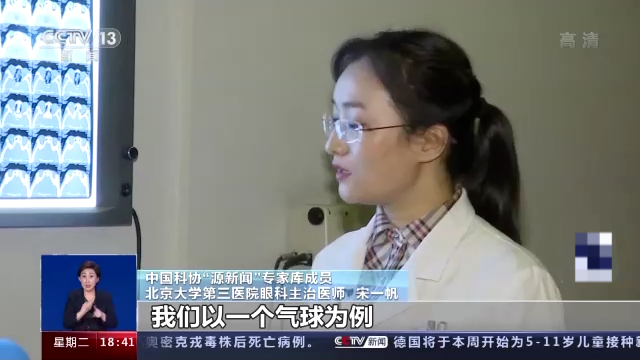 中国科协“源新闻”专家库成员 北京大学第三医院眼科主治医师 宋一帆:我们以一个气球为例,假设这就是我们的眼球,大家可以想象,如果我们往里面打气,气球就会变大,再随着压力越来越大,气球就会破掉了,但是幸亏我们的眼球还是比较结实的,我们的眼球不会破掉,但是会在眼球很薄弱的地方,也就是我们视神经的地方越压越深。