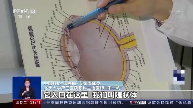 中国科协“源新闻”专家库成员 北京大学第三医院眼科主治医师 宋一帆:前面微微凸出的这个弧线,这是我们的角膜,就是大家看到的黑眼珠。后面这个圆圆的叫眼球。我们眼睛里面不是空气,里面是充满各种结构以及水。这个水(学名)叫房水,它不是一潭死水,是活水,它有进有出。