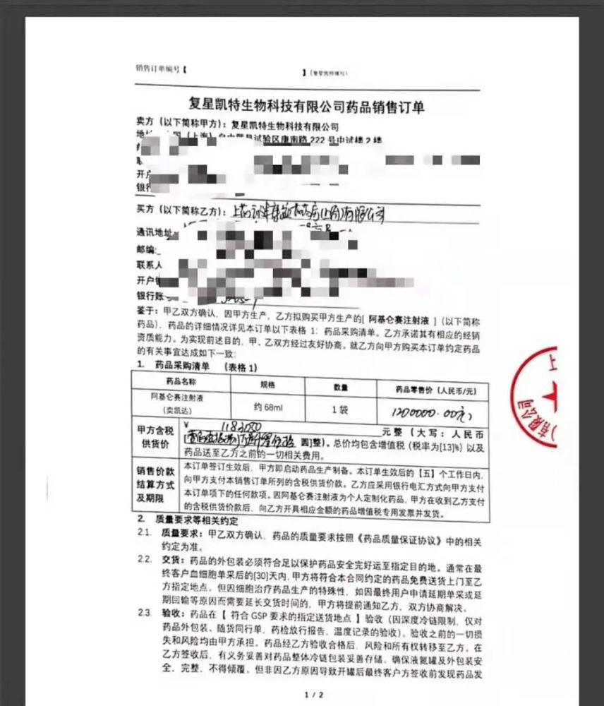 6月28日,一张疑似复星凯特阿基仑赛注射液(商品名:奕凯达)的药品销售订单在网上流传,其中显示阿基仑赛注射液零售价为120万元/袋(约68ml)。