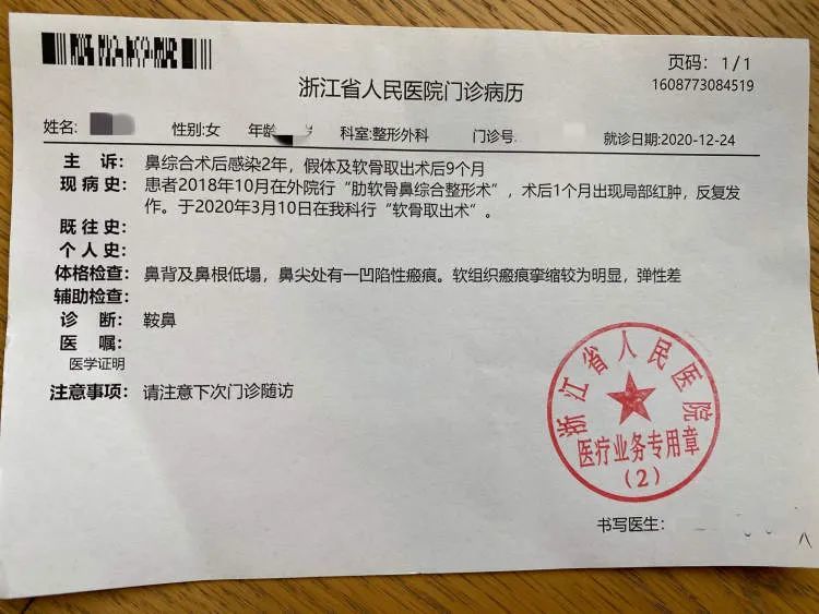 小尚说,为了修复鼻子上的癜痕,她几乎跑遍了国内最好的三甲医院,以及国内专门做鼻修复的专家,而且她还参加过上海市第九人民医院特需修复病例会。