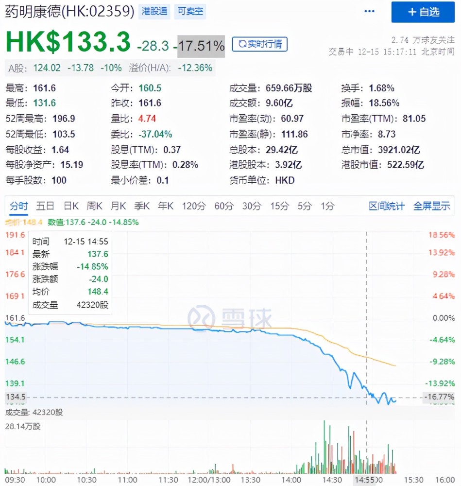 12月15日,药明康德A股尾盘跌停,报124.02元/股,总市值3665亿元,单日市值蒸发超400亿元;同时药明康德H股跌超17%,股价一度下探至131.6港元/股。