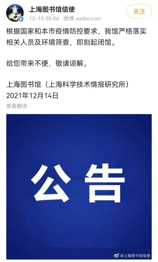 今天凌晨,上海图书馆信使发布消息,根据国家和本市疫情防控要求,严格落实相关人员及环境筛查,即刻起闭馆。