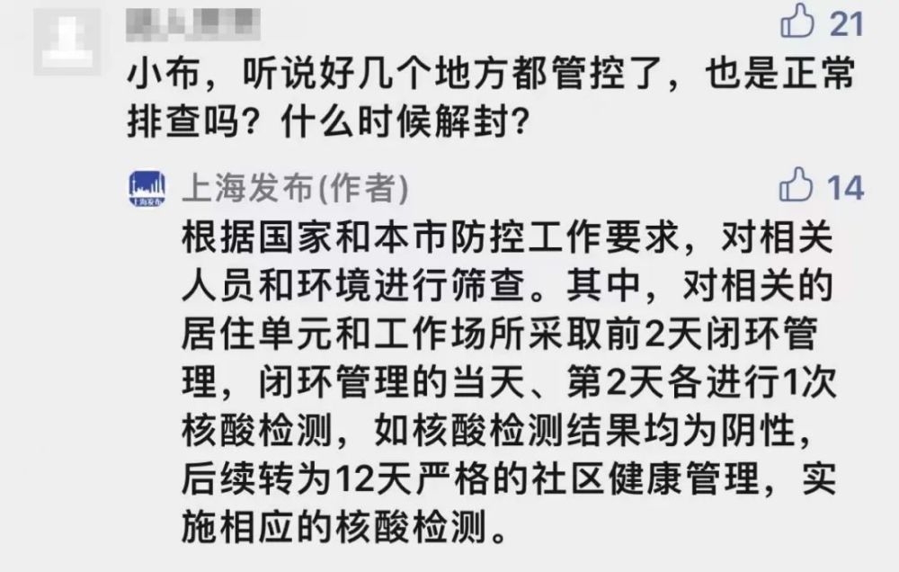 还有网友在评论区问:“听说好几个地方都管控了,也是正常排查吗?什么时候解封?”上海发布回应:“根据国家和本市防控工作要求,对相关人员和环境进行筛查。其中,对相关的居住单元和工作场所采取前2天闭环管理,闭环管理的当天、第2天各进行1次核酸检测,如核酸检测结果均为阴性,后续转为12天严格的社区健康管理,实施相应的核酸检测。”