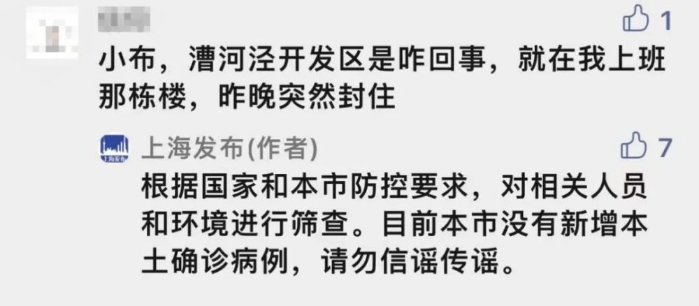“漕河泾开发区是咋回事,就在我上班那栋楼,昨晚突然封住。”上海发布回应:“根据国家和本市防控要求,对相关人员和环境进行筛查。目前本市没有新增本土确诊病例,请勿信谣传谣。”