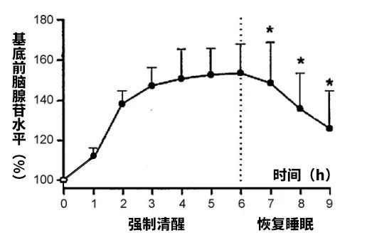 猫被剥夺睡眠 6 小时并被允许睡眠 3 小时后,基底前脑睡眠中心腺苷水平变化情况