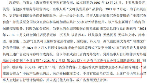 处罚文书显示,当事人为推销沉香灸保健按摩服务,宣传沉香气血灸“可以帮顾客达到排湿寒、缓病痛、补元阳、调气血的四大奇效”等图文广告宣传用语,上述沉香灸保健按摩服务不具有医疗用途,“至臻沉香套盒”中的产品也无药品、医疗器械批准文号,不具有疾病治疗功能。