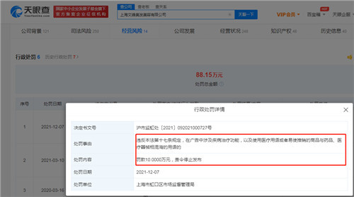中国经济周刊-经济网讯 天眼查App显示,近日,上海文峰美发美容有限公司被上海市虹口区市场监督管理局罚款10万元,处罚事由为在广告中涉及疾病治疗功能,以及使用医疗用语或者易使推销的商品与药品、医疗器械相混淆的用语。