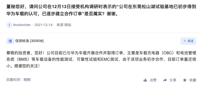 信测标准12月16日在深交所“互动易”平台回答投资者提问时称:公司目前已与华为车载开展合作并取得订单,主要是车载充电器(OBC)和电池管理系统(BMS)等车载设备的性能测试、可靠性试验和EMC测试,由于该项业务初步合作,目前订单量还很小。