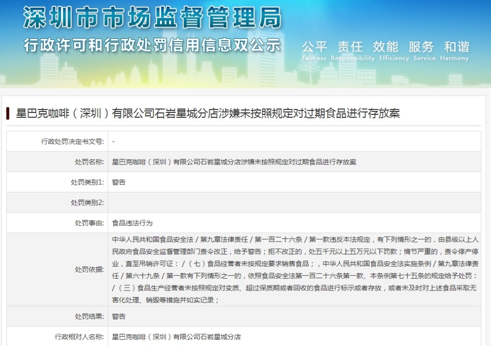 中新经纬12月16日电 从深圳市市场监管局获悉,近日,星巴克咖啡(深圳)有限公司石岩星城分店涉嫌未按照规定对过期食品进行存放,被深圳市市场监督管理局警告。