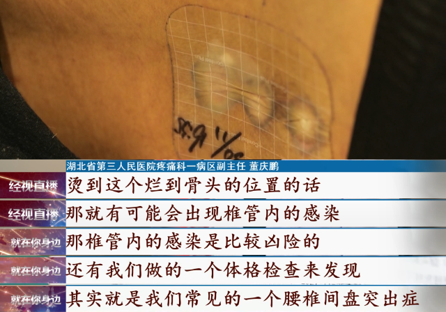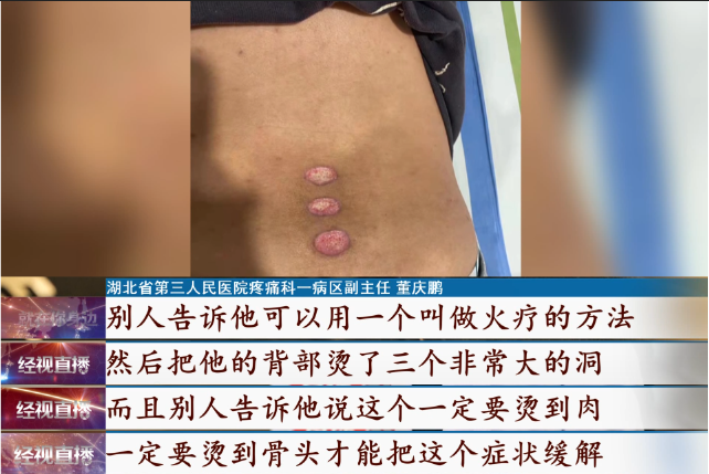 小王后腰上规则排列的三个洞就是偏方留下的印记。据医生介绍, 小王来自湖北监利,今年8月他在打完篮球后就突然发现右腿有些疼痛,最初以为是扭伤,就没在意。但几天后就发现腰部疼痛难忍,甚至晚上睡觉都会被疼醒。“别人说可以做火疗的方法,在背部烫三个大洞,并且要烫到肉、烫到骨头才能缓解症状。”小王说。