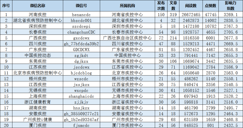 分析:榜单数据显示,@河南疾控 以3269.1的影响力指数高居榜首,@湖北省疾病预防控制中心 以2838.5的影响力指数屈居第二,@深圳疾控 以2767.3的影响力指数排列第三。