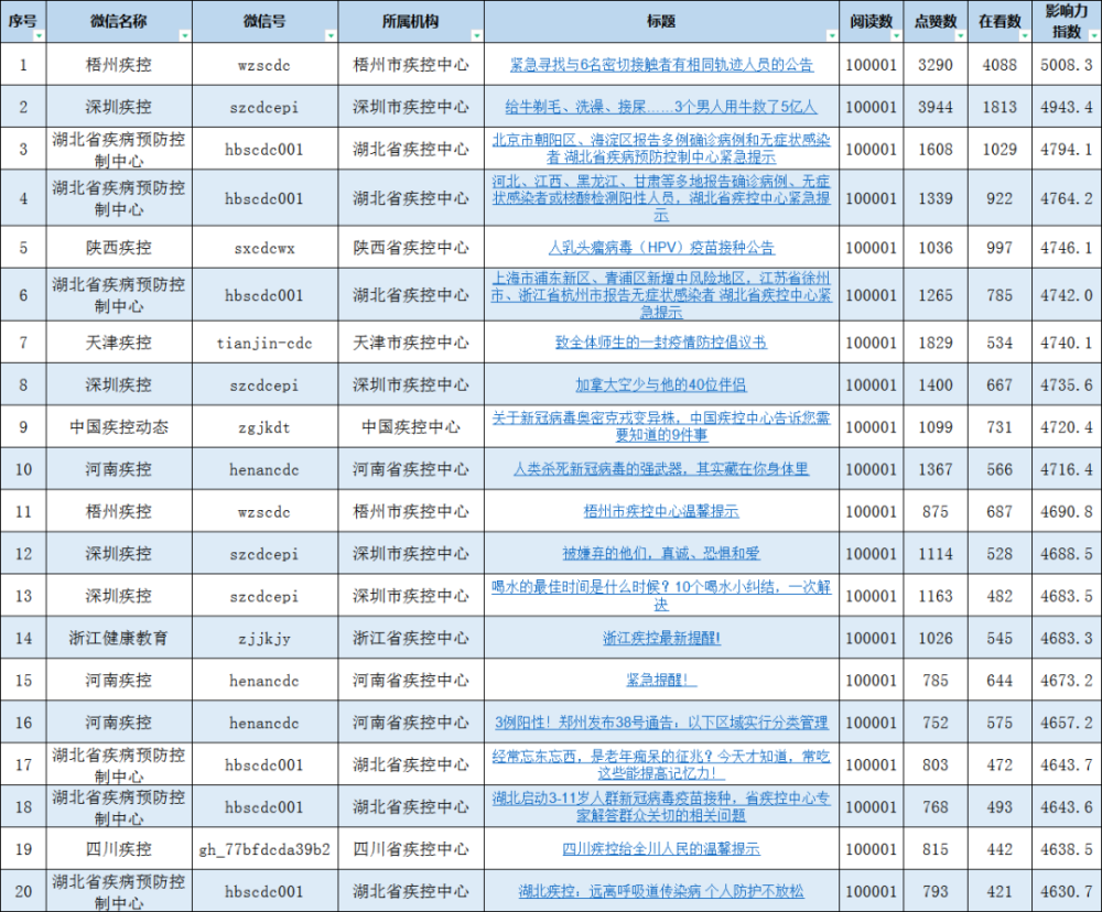 分析:@梧州疾控 发布的文章以5008.3的影响力指数高居榜首;@深圳疾控 发布的文章以4943.4的影响力指数屈居第二,共有4篇上榜;@湖北省疾病预防控制中心 发布的文章中有6篇上榜。11月份,网民主要关注各地最新疫情动态、疫苗接种情况、日常健康科普相关内容。