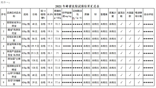 2021年蜂蜜比较试验结果 图片来源:深圳市消费者委员会