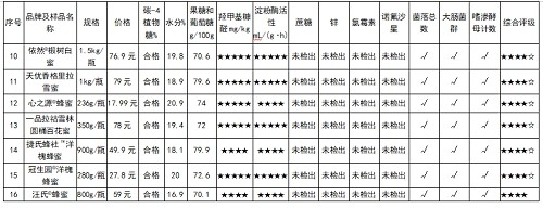 此外,本次比较试验将16款蜂蜜按照以下权重进行评级,安全指标占比20%,品质指标占比80%(碳-4植物糖占比10%,水分占比10%,果糖和葡萄糖占比10%,羟甲基糠醛占比20%,淀粉酶活性占比20%,蔗糖占比10%)。最终,9款蜂蜜获评五星,品质领跑,分别是甜甜蜜蜜深山原蜜、藏蜜高原百花蜜、初祖农耕土蜂蜜、甜蜜网事洋槐蜜、网易严选紫椴雪蜜私享装、醇加福土蜂蜜、夜郎蜂业百花蜂蜜、山萃洋槐成熟蜜、百花洋槐蜂蜜。