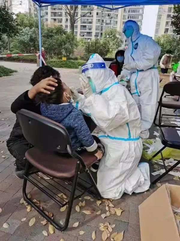 12月8日,张娅珍在支援东新园时蹲着给孩子进行核酸检测采样,路过的保安看到这一幕深受感动,随手拍下了一张照片。