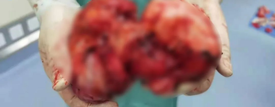 经术后测量,切除的肿瘤大小约20*18*12cm,重约2.5kg,术中出血量共100ml。术后病理结果提示为恶性梭形细胞肿瘤。
