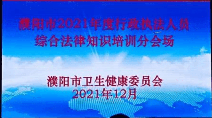 本报讯(记者陈述明 通讯员佀晓阳 韩楠)为进一步推进依法行政工作,加强法治政府建设,提高行政执法人员的执法能力和水平,根据统一安排,濮阳市卫生健康委于12月15日全天组织观看了濮阳市2021年度行政执法人员综合法律知识网络视频直播培训。