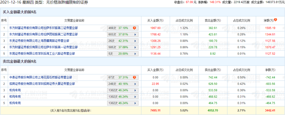 中国经济网北京12月16日讯 今日,明月镜片因属于无价格涨跌幅限制的证券而登上龙虎榜。截至今日收盘,明月镜片每股报67.09元,涨幅149.31%,成交额14.94亿元,振幅67.04%,换手率74.90%,总市值90.13亿元。