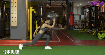 要点:挺胸收腹,一侧腿部向后做一个大幅度的弓箭步,下压身体的同时双手配合挥动,然后臀腿发力,抬升身体,把大腿抬起至水平位置,在最高点稍作停留。若干次后,换另一侧腿部重复,动作过程注意保持核心收紧,身体才能稳定。锻炼60秒,组间休息30秒,目标完成3组