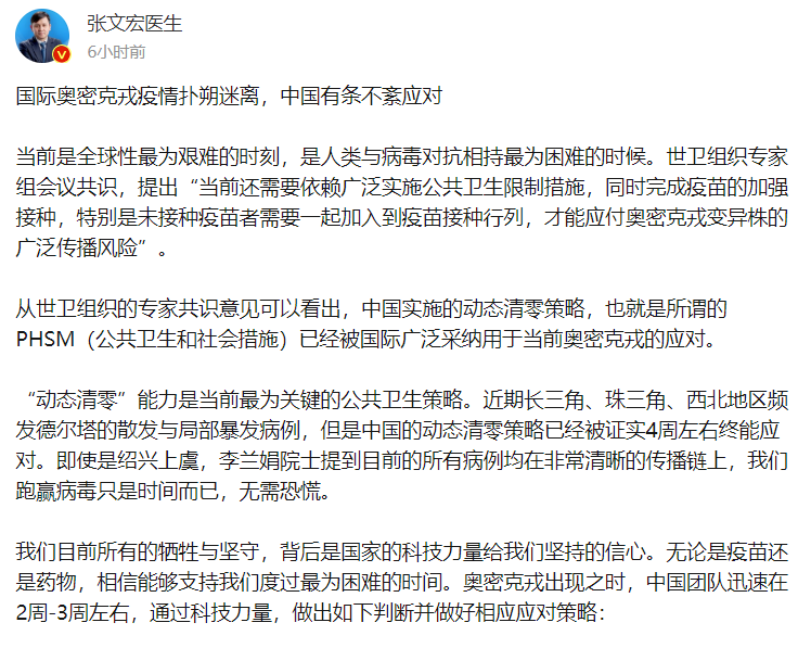 12月17日凌晨,张文宏医生通过其微博发声,国际奥密克戎疫情扑朔迷离,中国有条不紊应对。