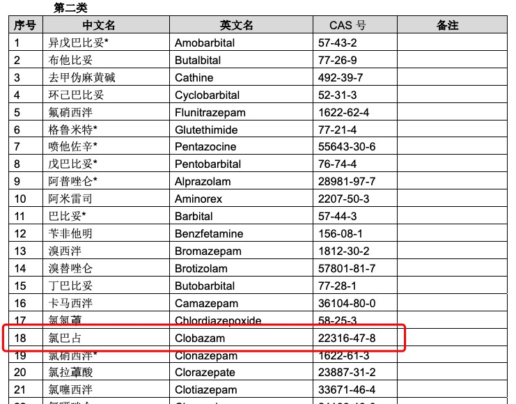 在我国 2013 年版《精神药品品种目录》中,氯巴占被列为第二类精神药品,同时,没有「*」标注意味着氯巴占并不是我国生产及使用的品种。