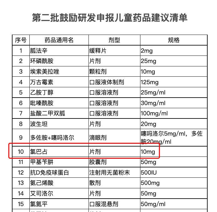 2017 年 5 月,原国家卫计委等机构组织专家,结合中国大陆境内尚未注册上市且临床急需的儿童用药现状,提出了《第二批鼓励研发申报儿童药品建议清单》。氯巴占名列其中。