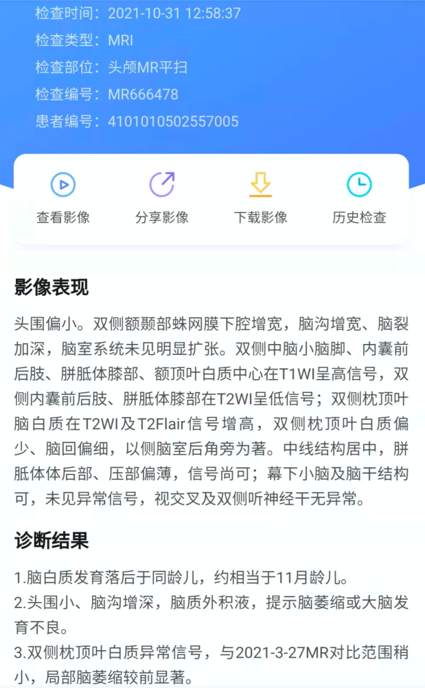 刚开始确诊的时候,阳阳的脑部核磁看不出什么问题,但最近一次复查,核磁显示阳阳的「脑白质发育落后于同龄儿,约相当于 11 月龄儿」,并提示存在脑萎缩或大脑发育不良。