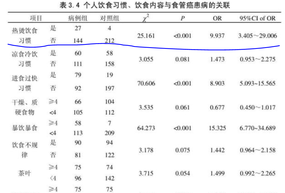 王瑞民[2]也曾对食管癌患者危险因素进行调查分析,对众因素进行单因素分析后,结果表明:热烫饮食为食道癌患病的风险因素之一。