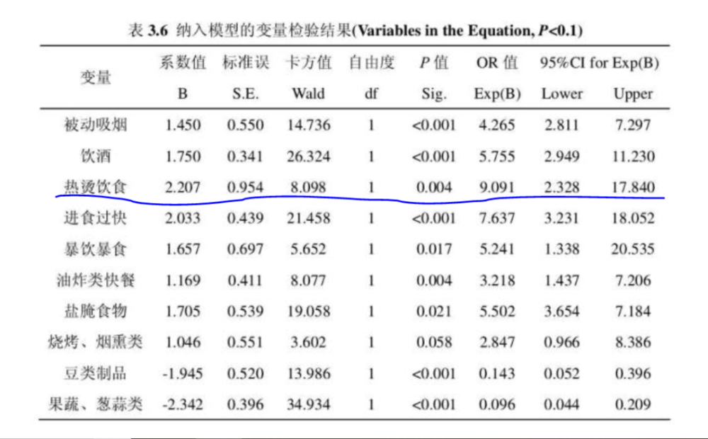 之后将多个单因素放在一起分析它们与食道癌患病率的关系,结果显示:热烫饮食与食道癌患病率呈正相关关系,为危险性因素,且在检测的众多因素里面,热烫饮食为最大的风险因素,热烫饮食习惯者是普通饮食者患食道癌风险的9.091倍。