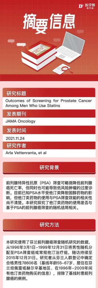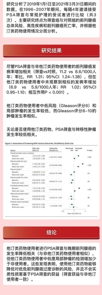 在此背景下,JAMA Oncology发表的这项研究调查了基于PSA的筛查对他汀类药物使用者和非使用者前列腺癌发病率和死亡率的相关性。