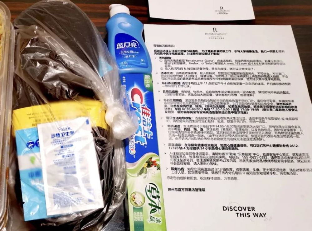 后来,酒店工作人员送来洗漱和清洁用品。并附上了关于日用品、餐食、垃圾收取、物资递送,以及心理健康咨询热线的详细说明。
