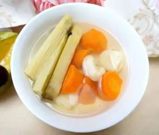 制作:马蹄去皮洗净,甘蔗切成10厘米的长段后切成条,红萝卜去皮切块,红枣去核。全部食材入锅,加水、冰糖,大火烧开转小火慢炖1小时即可。