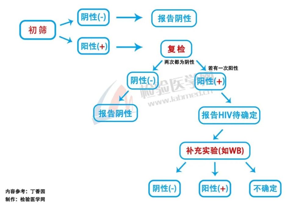 HIV抗体检测包括筛查试验和补充试验。简单来说,就是首先通过酶联免疫吸附试验(ELISA)、化学发光或免疫荧光试验等多种方法进行初筛,排查出可疑结果,使用原有试剂双份 (快速试验) / 双孔 (化学发光试验或 ELISA) 或两种试剂进行重复检测,重复检测结果中一旦一个检测有异常,就要进行补充试验,通过HIV核酸检测进一步确认。
