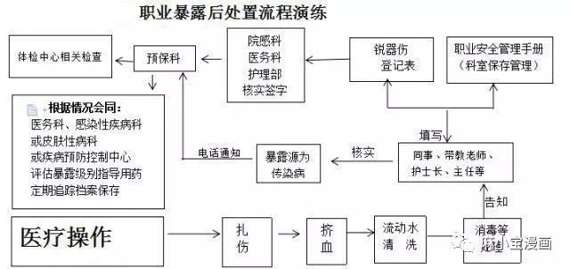 职业暴露已经发生,向医院感染管理科(院感)通报,抽血检测,一旦发现有感染的可能性,就可由医院向防疫站申请阻断剂。对于医护人员来说,如果在工作中产生艾滋病病毒职业暴露,可以免费用药。各地的艾滋病病毒职业暴露处置机构由卫生行政部门指定,并向社会公布名单和相关服务信息。如果不在院内或者手续过于繁杂,可以通过拨打12320卫生热线,获取检测与药物支持(建议还需告知院感)。