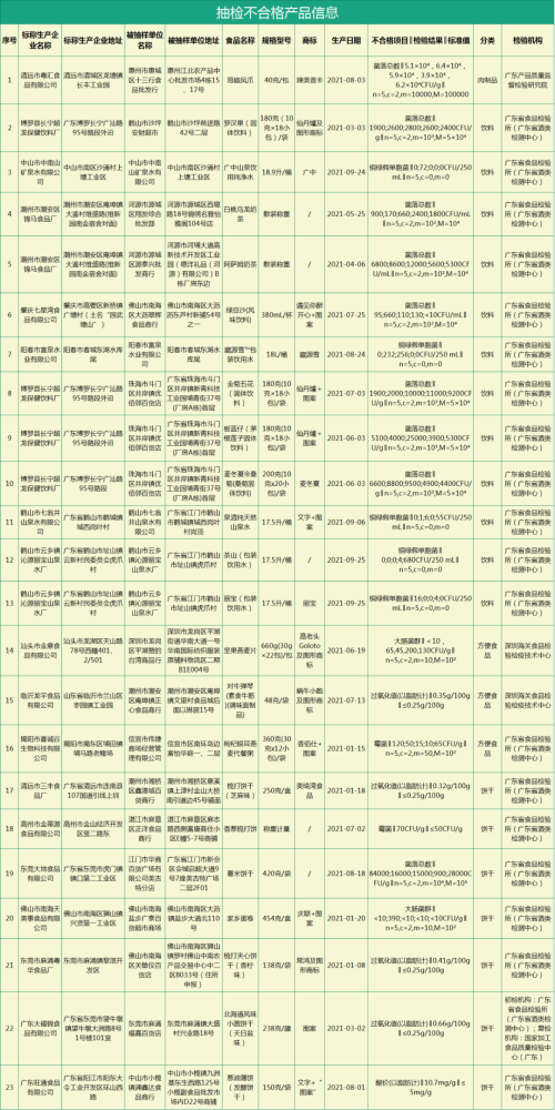 根据2021年国家和广东省食品安全监督抽检计划,广东省市场监督管理局组织抽检粮食加工品、乳制品、肉制品、饮料、方便食品、饼干和食用油、油脂及其制品等7类食品963批次样品。根据食品安全国家标准检验和判定,其中抽检项目合格样品940批次、不合格样品23批次,检出微生物污染及其他指标问题。