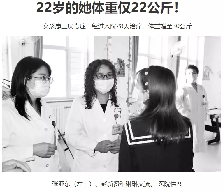 11月初,长春市第六医院心理科迎来了一位特殊的女性患者。她双颊凹陷,骨瘦如柴,身高158cm的她,体重却只有22公斤。并且,这位女孩还伴有严重的进食障碍,后经医生诊断为神经性厌食症。