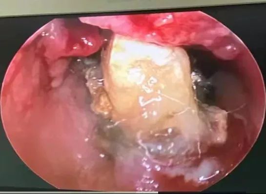 在做鼻内镜时,韩永成医生发现齐先生鼻子里面有糜烂和炎症,更严重的是,还有一个白色坚硬的类似牙齿的东西!