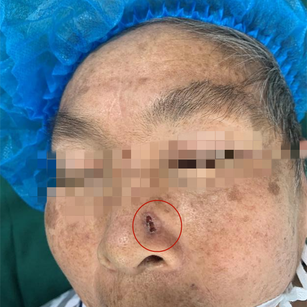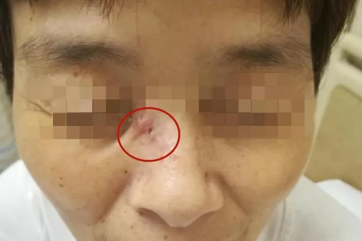 医生表示:这是近期接诊的第三例外鼻基底细胞癌患者。和李女士类似,69岁的浙江衢州江山人玉女士和52岁的浙江绍兴人兰女士也是因为鼻子表面发黑、发红的“新生物”近一年来突然增大,虽然没有鼻子内部的其他不适,但肿物反复溃烂、结痂再溃烂,开始并未当回事的两人才选择就医,最终被确诊为“外鼻基底细胞癌”。