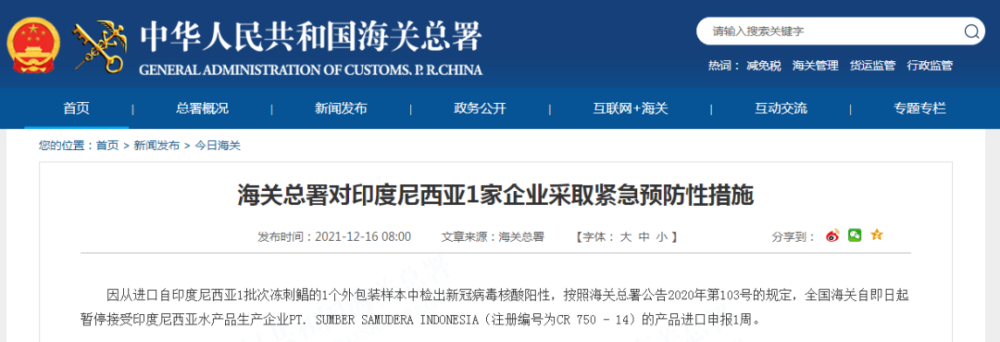 据海关总署网站12月16日消息,因从进口自印度尼西亚1批次冻刺鲳的1个外包装样本中检出新冠病毒核酸阳性,按照海关总署公告2020年第103号的规定,